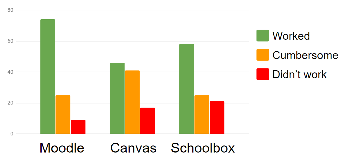 Test scripts were created that covered most of the criteria, some tests combining multiple criteria. Test steps were defined for each of the three systems in an electronic form that led the user through the test. Staff and parent representatives were invited to complete a relevant test across each system and to rate their experience with the systems as “Worked”, “Worked, but was cumbersome” or “Didn’t work” together with free-form comments. Over 100 tests were completed by users leading to a solid set of opinions with Moodle proving most functional, followed by Schoolbox and Canvas.