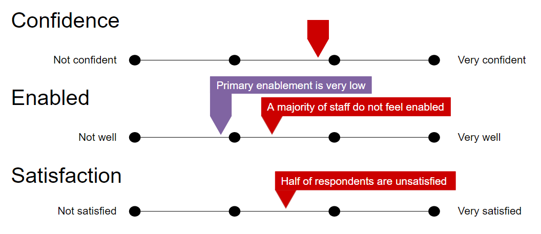The first step was determining the need for change. Before we could commit to an expensive change, we wanted to objectively know it was necessary. At CGS, the LMS is used for three main purposes: as a learning environment, as a means of making announcements and as a portal to access other systems. A survey was created to gauge whether users felt confident, enabled and satisfied with the incumbent system across these purposes. We also asked users to identified how they were enabled and blocked in their use. The survey was voluntary but yielded a 61% response rate, which allowed confidence in the results. In relation to use as a learning environment, the findings showed users were confident, but most did not feel enabled and half were not satisfied. Similar results were found for other purposes of the system.