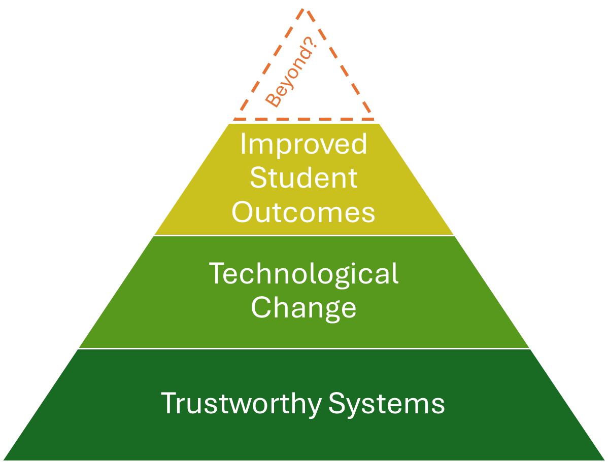 The relationship between teaching staff and an IT Team matures in stages. For example, IT staff may have an ingenious plan to improve student outcomes, but if teachers don’t trust IT systems, like AV in classrooms, they will not cooperate in such projects. Conversely, as IT teams deliver more trustworthy systems and successfully deliver change, teachers will be more likely to seek collaboration with IT staff on projects targeting student success. The following diagram depicts what teachers want in a graduated hierarchical sense. I don’t think teachers necessarily have this model in their mind, but I know that they won’t engage IT staff at higher levels if they are not satisfied with the lower levels first.